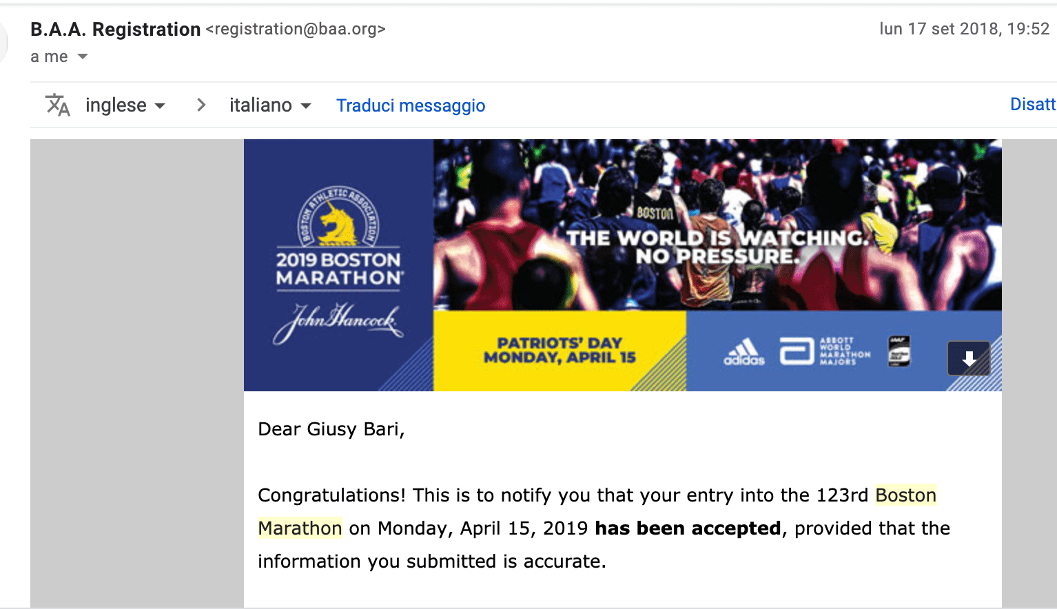 ma quelle parole cambiavano tutto: Congratulation! This is to notify you that your entry into the 123rd Boston Marathon on Monday, April 15, 2019 has been accepted…